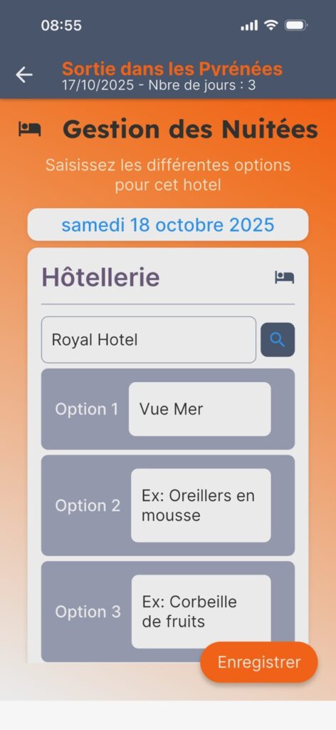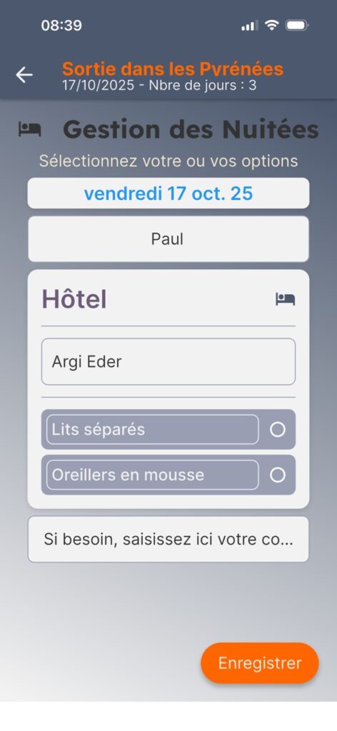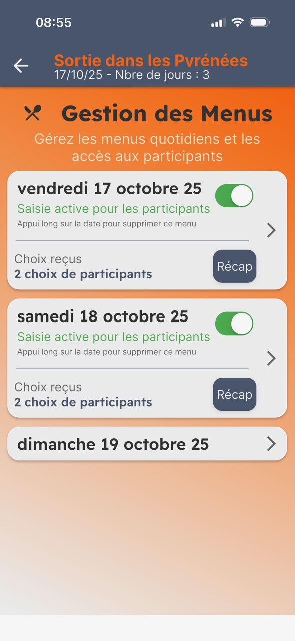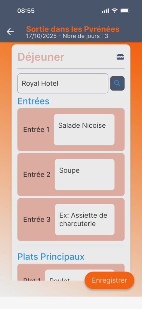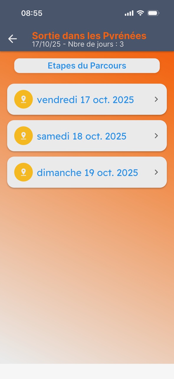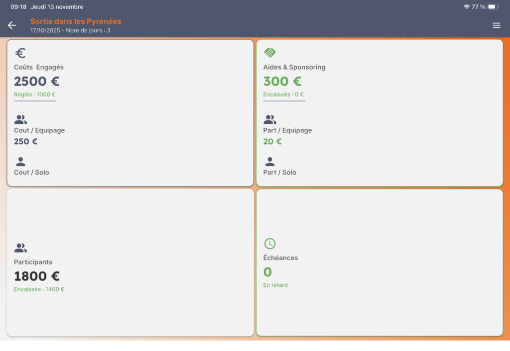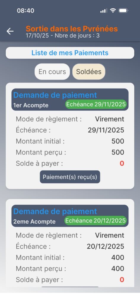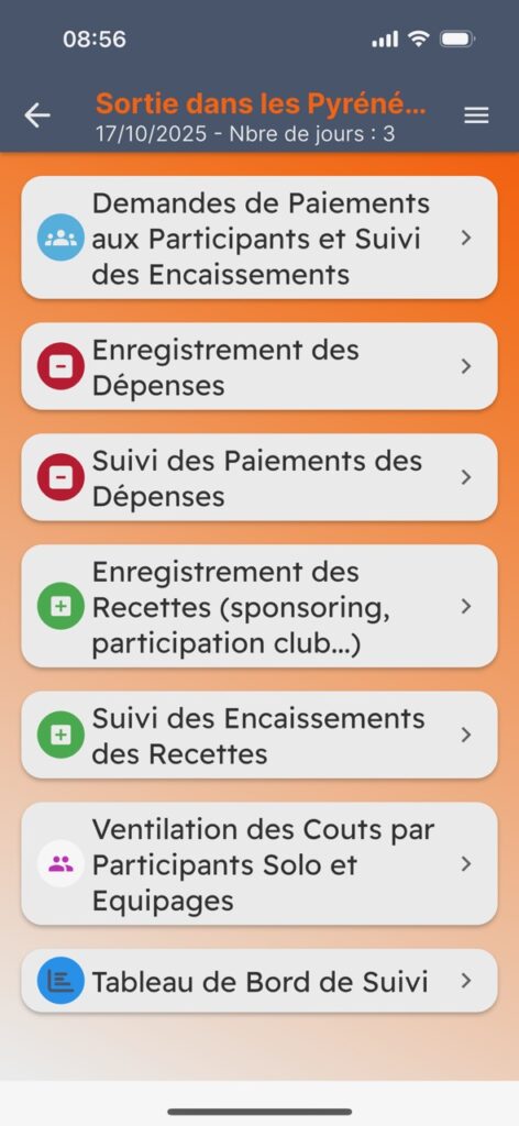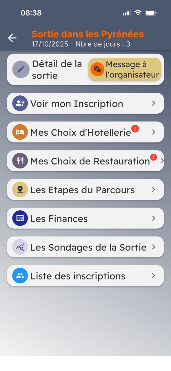 Ce module vous accompagne dans l’organisation de vos sorties, qu’elles soient sur plusieurs jours ou simplement autour d’un repas, en gérant les préinscriptions, les inscriptions, les listes d’attente, le choix des menus, les options d’hébergement, les étapes du parcours, ainsi que toute la partie financière avec les demandes de paiement, le suivi des encaissements et un tableau de bord de gestion.